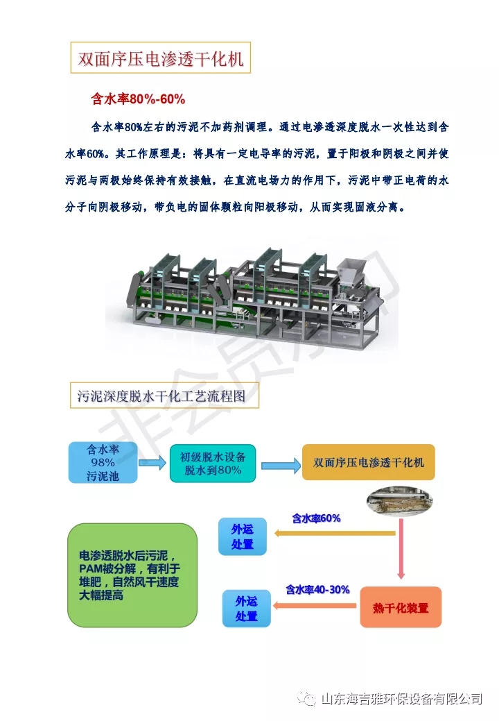 电渗透脱水技术是目前国际上前沿固废减量技术,减量过程只消耗电能,我司研发的双面序压电渗透脱水机,能耗低,处理量大,清洁无污染,符合国家固废处理的减量化、无害化,节能减碳的资源化标准,产品属国际领先水平;面对当前世界工业4.0的大趋势,将高效、智能、创新,减碳作为设计核心,开展推动整体产品的研发工作。卧螺离心机作为特种固液分离设备,其中油、泥、水分离环保处理工艺装备荣获2020年度山东省科技进步奖。