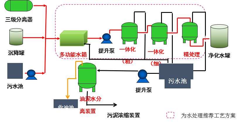 该工艺在来水含油≤80mg/L,悬浮物含油≤60mg/L的情况下,处理后的水质满足含油10mg/L,悬浮物含油≤10mg/L(SS以现场测试为准,含压裂液和钻井液污水除外)。…